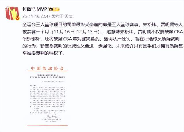 既然有了这样的闹剧,自然也就不能默默无名收场。这不,11月16日晚上,篮协发力了,开出了一张重磅罚单,朱松玮、贾明儒、李盛东、李承耀被禁赛一个月,时间从2025年11月16日到12月15日。