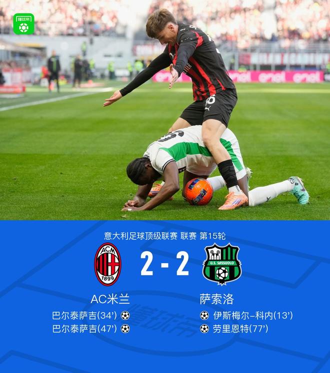 北京时间12月14日意大利足球顶级联赛联赛第15轮,米兰主场对阵萨索洛。米兰方面巴尔泰萨吉梅开二度,恩昆库、奇克分别助攻。萨索洛方面伊斯梅尔-科内、劳里恩特分别破门,皮纳蒙蒂2次助攻。最终比分米兰2-2萨索洛。